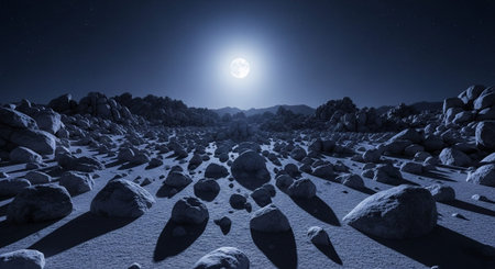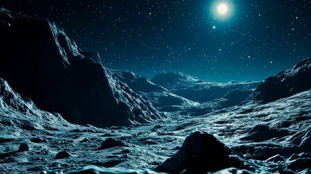 The moon shines brightly over a desolate landscape, casting long shadows on the craters below