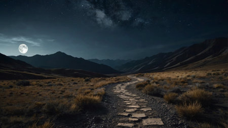 Dirt road in the mountains at night with full moon. 3d rendering