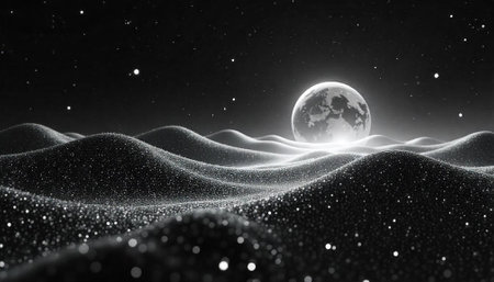 Dreamy monochrome landscape with moon and stardust horizon