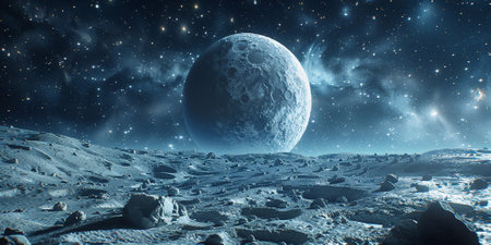 Fantastic lunar surface and big planet at night in deep space