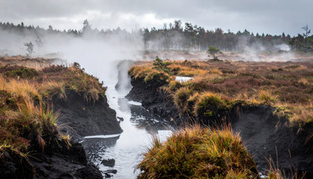 Steam rises from a geothermal river as it carves a path through a wild, misty moorland.