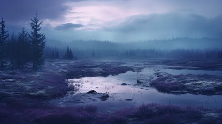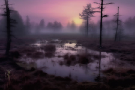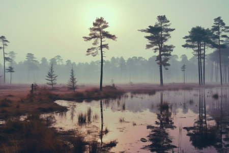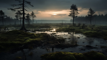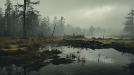 a swamp, adorned with moss and trees, showcases a captivating blend of contrasting lights and darks. this british topographical scene exudes a hazy ambiance, adding to the allure of the landscape. ai generated