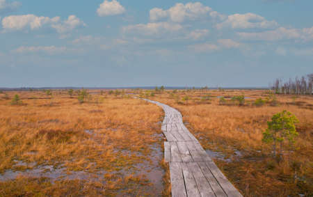 Swamps. Belarusian swamps are the lungs of Europe. Ecological reserve Yelnya. Yelnya National Landscape Reserve trail over a bog , Belarus.