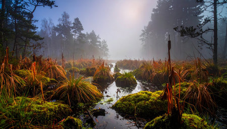 A tranquil marsh scene at dawn with a misty atmosphere. The still water reflects the golden grass and trees, creating a serene outdoor landscape. Perfect for nature lovers.