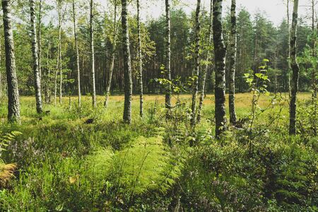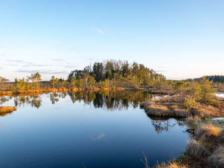 Beautiful landscape with water of calm lake or swamp in autumn or summer evening. Concept of a walk, rest and travel on nature. Nature in Finland or Karelia in Russia