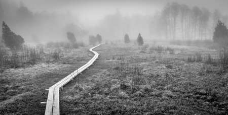 Monochromatic panorama landscape of Swedish footpath through the marsh