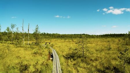A wooden path in the Soomaa National Park in Estonia among the forest and marshland on a clear day