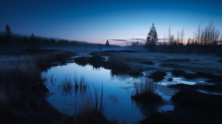 Generative AI : Dramatic Twilight Sky With Rising Planet Venus Over Swamp Landscape Misty Morning Time Soft Colors Amazing Glowing Stars Effects Above Lonely Trees Morning Fog Cove