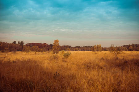 Swamp Yelnya in autumn landscape. Wild mire of Belarus. East European swamps and Peat Bogs. Ecological reserve in wildlife at sunset. Marshland at wild nature. Swampy land and wetland, marsh, bog.