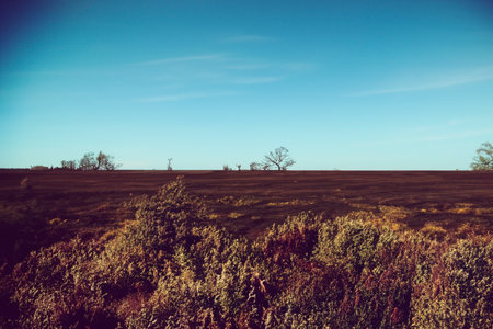 Swamp Yelnya in autumn landscape. Wild mire of Belarus. East European swamps and Peat Bogs. Ecological reserve in wildlife. Marshland at wild nature. Swampy land and wetland, marsh, bog.