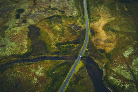 Wooden hiking trails in swamps or bog in Estonia. Drone aerial view