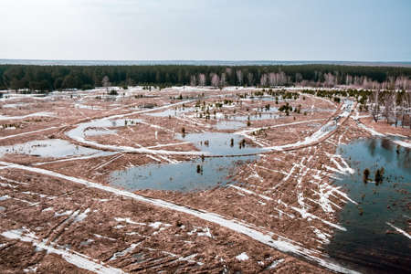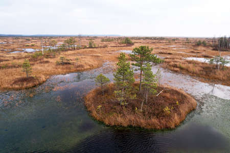 Spring landscape in the swamp. small swamp lakes, mosses and pines. small islands of swamp water. Spring Mars Landscape. Small Lake with Swamp Islands.