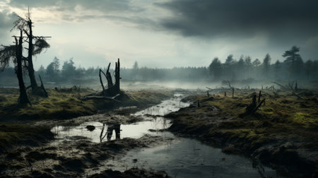 a swamp, adorned with moss and trees, showcases a captivating blend of contrasting lights and darks. this british topographical scene exudes a hazy ambiance, adding to the allure of the landscape. ai generated