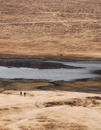 A river meanders through expansive fields of orange vegetation, contrasted by the deep blue of the water and a moody, overcast sky. The composition emphasizes the natural textures and colors of the landscape. Suitable for use in environmental, travel, or artistic projects, offering visual appeal.