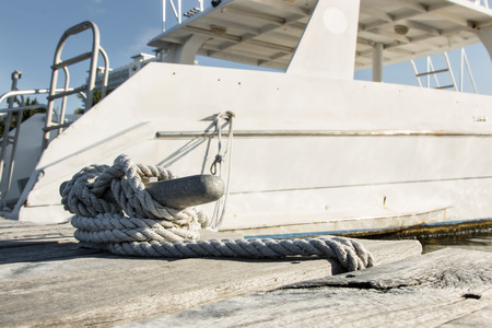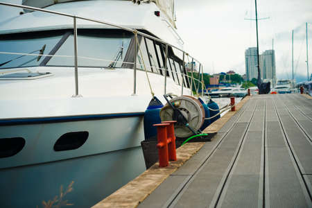 luxury yacht is moored in port. Sea ship is tied with a white rope to the metal bollard on the dock, closeup. Doc and boat parking. Travel at sea