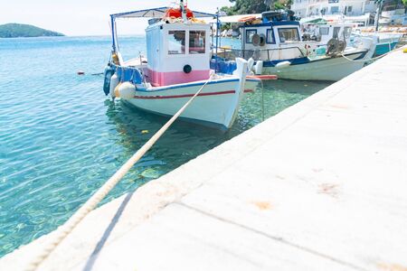 Traditional Greek fishing boats moored along Old Port pier on Skiathos