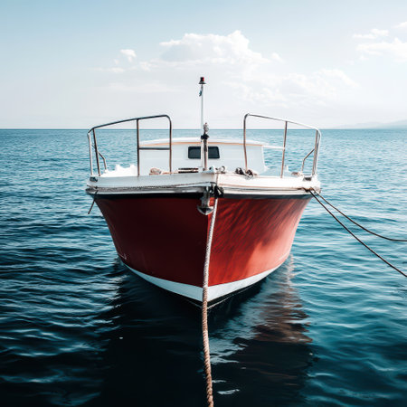 A red boat is anchored peacefully in clear blue water under a bright sky reflecting sunlight and creating a serene atmosphere.