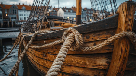 A wooden boat docked at the pier, with its bow turned to face forward and ropes tied around it, on an open marina in a Venetian-themed style. The background features buildings along the harbor's edge, adding depth to the scene. Captured from a close-up perspective using a Canon EF-S lens, the photo captures the details of the weathered wood texture and rope texture. It was taken during daylight with natural lighting that highlights the textures and colors, creating a realistic and detailed composition. --chaos 30 --ar 16:9 --v 6.1 Job ID: 973ae1f3-c170-4919-a0ec-4523b5950966