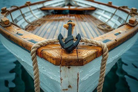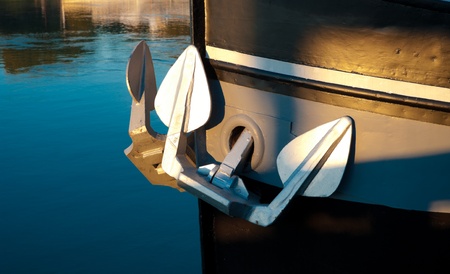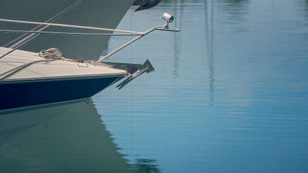 Close up of the bow of a luxury boat with anchor on deck and water reflections