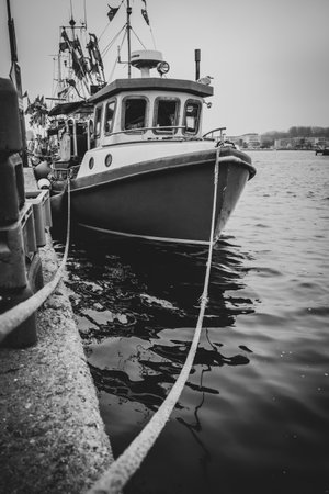 Photo of fisherman ship moored in port. Sea shore in Jastarnia.
