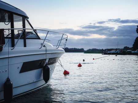 moored motorboat or motor yacht on the pier on a summer evening on the lake