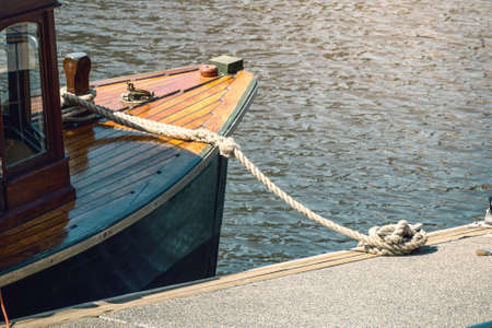 The yacht is tied with a blue rope to the shore on the pier. Copy space
