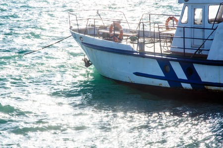 Close up of front side of fisherman ship moored in port. Colorful abstract background of piece of ship