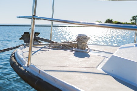 Closeup picture a rope tied to a metal cleat on a yacht deck closeup