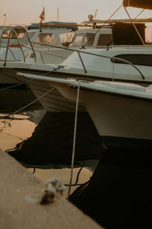 There are many yachts, boats and ships at sea. Marina at sunset.