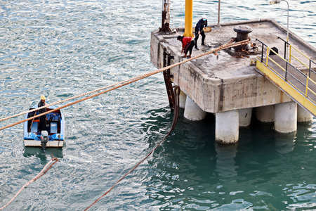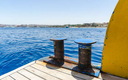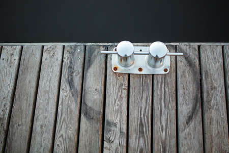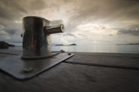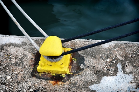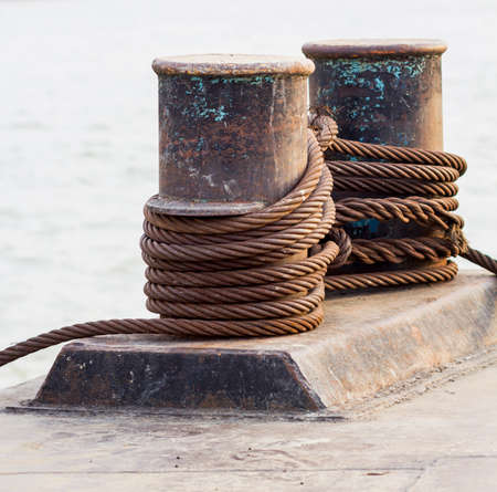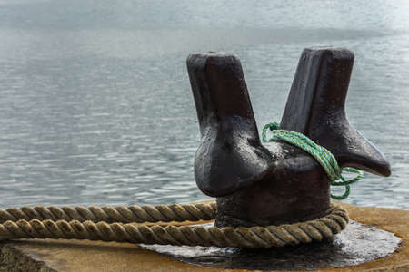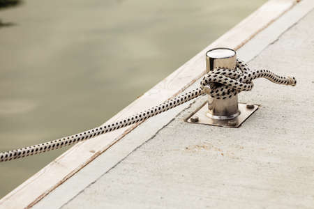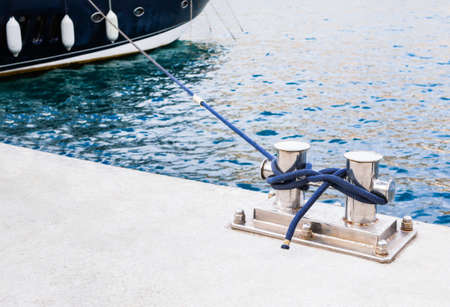 Jetty objects concept. New metal steel harbor marina bolts with ship and boats ropes.