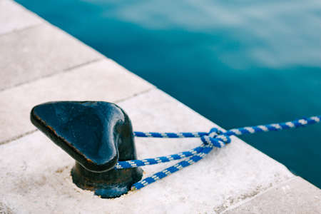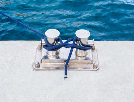 Knecht mount on a marina with a blue rope tied. Top view, close up