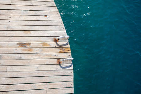 Wooden planks on the pier above the blue sea. Wooden planks on top of the water.