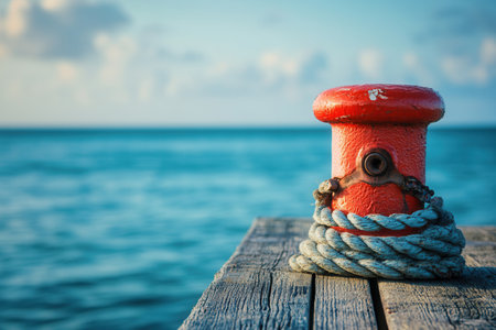Thick marine rope on wooden pier in harbor, symbolizing strength, shipping industry, and maritime safety.
