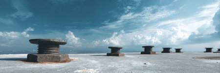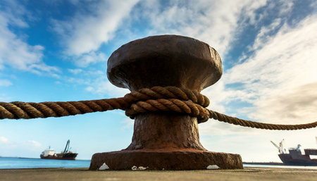 Close-up and bottom view of a rusty mooring bollard with ropes or hawsers on the quay of the port against a blue sky with clouds. Mooring concept for very large ships. Generative Ai.