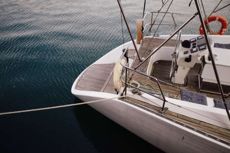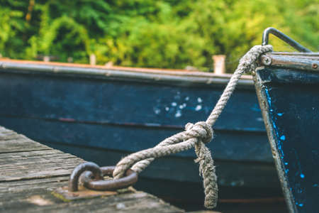 The yacht is tied with a blue rope to the shore on the pier. Copy space