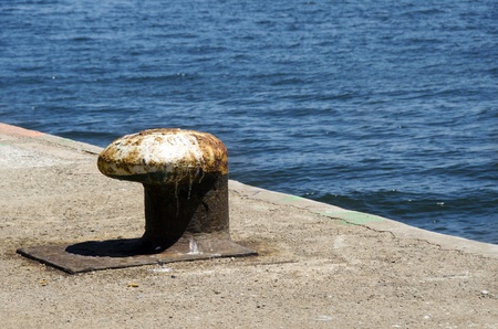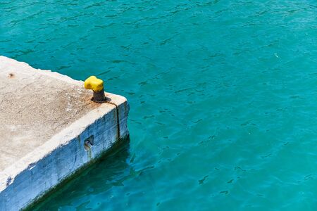 Metal mooring bollard on the dock of concrete harbor pier, selective focus on bollard, space for text