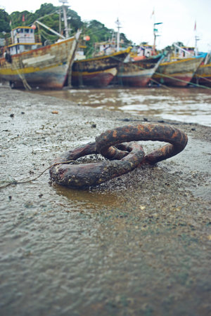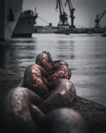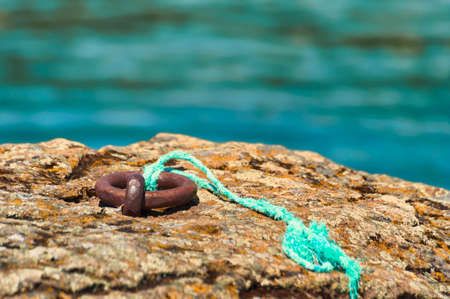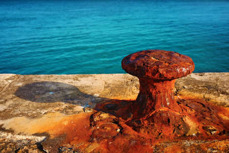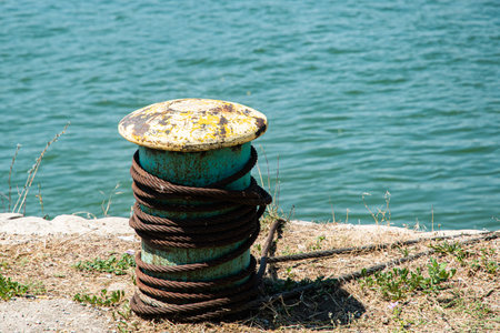 Rusty metal bollard, anchored at the edge of the port. Blue sea in the background. A thick rope is seen next to the bollard. A metal chain is tied around it.