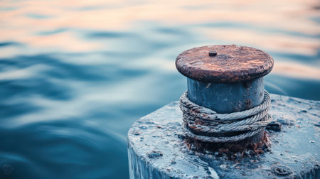 A worn mooring post stands firm wrapped in a thick rope as gentle waves reflect soft colors of sunset creating a serene atmosphere.