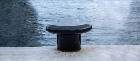 Black bollard on harbor pier, rippled sea water background, copy space. Heavy metal post anchored on quay concrete floor