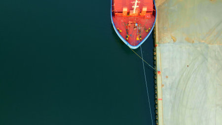 Bow of a cargo ship at port with mooring lines securing the vessel to the bollards on the dock. Aerial view. . High quality photo