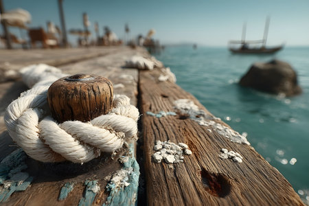 Weathered wooden dock with a coiled rope, set against a serene coastal backdrop. a blurred traditional boat on the turquoise water enhances the nautical ambiance, ideal for coastal-themed designs or prints. Generative AI