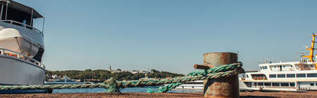 Rope of moored ship on coast in Istanbul, Turkey, banner