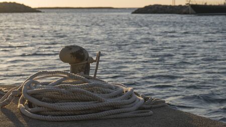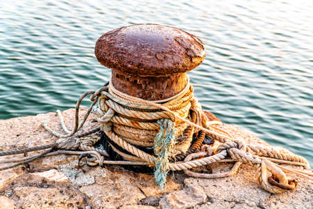 An old and rusted bollard, with several ropes rolled up on itself. Perfect shot for marine life, tourism and cruises.