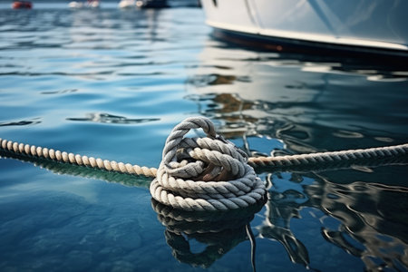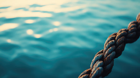 A close-up view of twisted rope resting on the surface of calm blue water, capturing the delicate interplay of light and texture for a serene atmosphere.