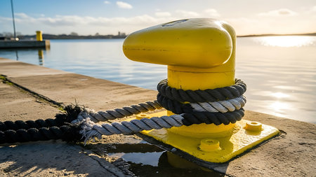 This image features a bright yellow mooring bumper securely fastened to a concrete dock. The bumper is equipped with a thick, braided rope that is coiled around it, suggesting it is used to secure boats. The scene is set against a serene waterfront backdrop with calm water and a clear sky, indicating a peaceful maritime environment.