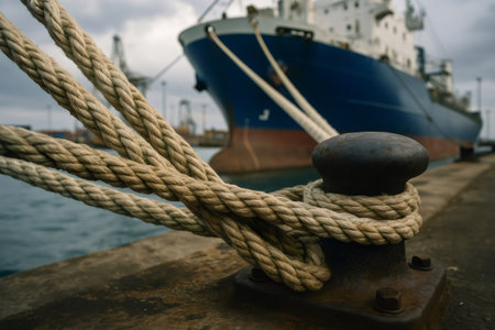 Close up of mooring ropes tied around a bollard, securing a large container ship to the dock in a bustling commercial port