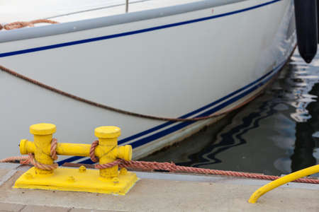 yacht moored with a line tied around a fixing on the quayside, mooring at a pier close up view