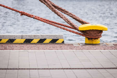 Shipping objects concept. Sailing ropes tied around yellow marina bollard. Outdoor shot on sunny day.