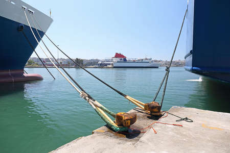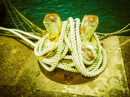 Jetty objects concept. Harbor marina bolt with ship and boats ropes, outdoor shot