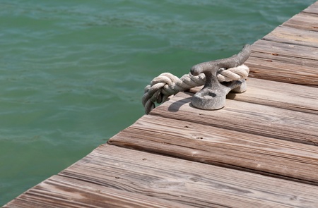 A rusty bollard in the dock with a tied rope.